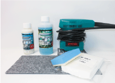 ガラスに蓄積された結晶化した水垢(鱗)を溶かしながら研磨して鱗を除去する。
